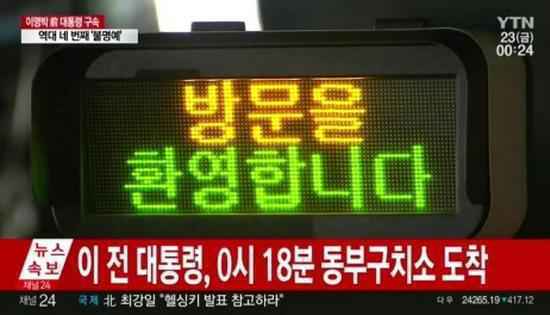 如果说上述例子还是巧合,下面这家电视台的情况,可能就是“故意”的了。22日晚,法院签发逮捕令后,李明博从家中被移送至首尔东部拘留所。结果,当李明博抵达拘留所时,YTN电视台的镜头恰好定格在写有“欢迎访问”的电子屏上,而且,该画面此后反复出现多次,让人浮想联翩。