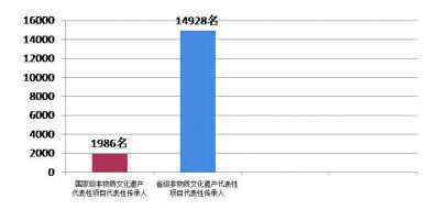 截至2016年,文化部命名了四批共1986名国家级非物质文化遗产代表性项目代表性传承人,各省(区、市)批准公布了14928名省级非物质文化遗产代表性项目代表性传承人。