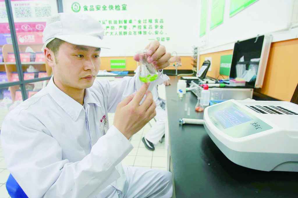 图为淮安一超市食品快检室技术人员正在进行蔬菜农残检测。