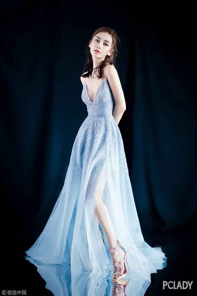 当天Angelababy身着Paolo Sebastian天蓝色透视网纱钉珠镶钻亮片收腰开叉拖地礼服裙,脚踩Giuseppe Zanotti五角星一字带高跟凉鞋,少女感十足。