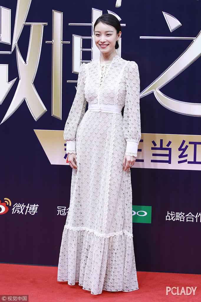 倪妮身穿Gucci2018春夏系列羊腿袖蕾丝收腰连衣裙,温婉大方。