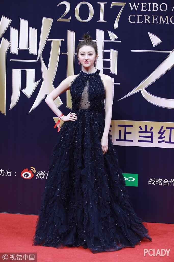 景甜身穿Jenny Packham削肩藏蓝色荷叶边蛋糕晚礼服,选色显得肤白纤细,总体来说中规中矩。