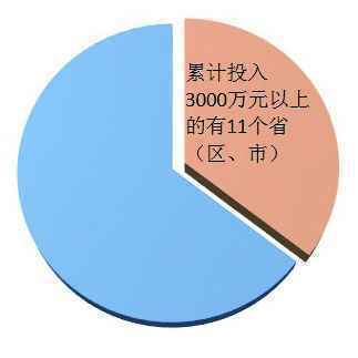 2011年至2015年底,全国各省级财政累计投入163731万元(含新疆生产建设兵团),省级财政平均累计投入5117万元(含新疆生产建设兵团)。累积投入5000万元以上的有10个省(市)。